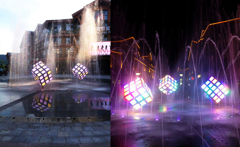 魔方燈采用聲光電和智能控制相結(jié)合,并配以高效的LED光源。夜幕降臨,3組魔方燈通過預(yù)設(shè)的光效變換模式,開始了絢麗的燈光秀,時而忽快,時而忽慢;時而交相輝映,時而如夢如幻,伴隨著音樂,與噴泉共同演繹一幕幕動感的燈光舞劇,為游客呈現(xiàn)一場美輪美奐的視覺盛宴。