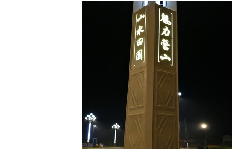 燈桿中部加裝節(jié)日氛圍燈帶,為夜間的營山縣城增添了一份濃濃的節(jié)日氛圍。燈座下部燈箱上刻有“魅力營山、山水田園”的字樣。
