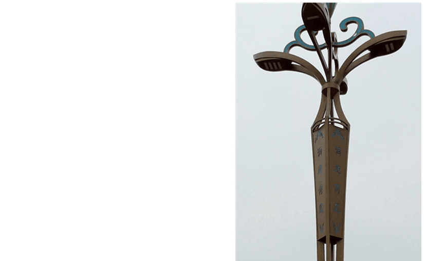 該燈型突出洞庭的荷花,荷花為中國(guó)十大名花之一,既具有觀賞價(jià)值,又象征高潔優(yōu)雅。佛教尊荷花為神圣凈潔之花,是“出淤泥而不染”清白圣潔的精神象征,燈桿花瓶造型寓意為觀音之凈瓶,含佛教旨意。