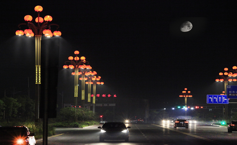 石門(mén)大道是石門(mén)火車(chē)站進(jìn)入石門(mén)縣城的迎賓大道,雙向六車(chē)道,人流量車(chē)流量都很大,設(shè)計(jì)者據(jù)此設(shè)計(jì)了1+3+6三層組合的15米高的柑橘景觀路燈“碩果累累”,燈柱部分是“中國(guó)柑橘之鄉(xiāng)”的篆體紋飾,突顯石門(mén)“柑橘”元素。2017年春節(jié)前完工。石門(mén)二橋是跨流經(jīng)石門(mén)縣城的澧水大河的老橋,雙向兩車(chē)道人流量車(chē)流量相對(duì)較少,設(shè)計(jì)者設(shè)計(jì)了安裝了1+4兩層組合7.5米高的柑橘景觀路燈。項(xiàng)目于2017年4月完工。這兩款燈型均內(nèi)置LED光源,節(jié)能環(huán)保。