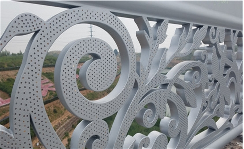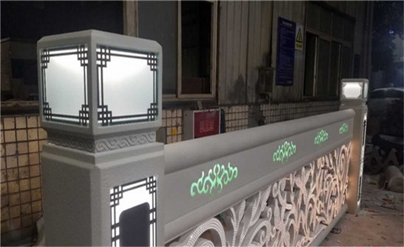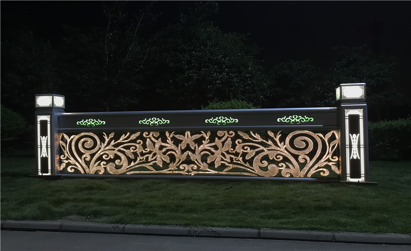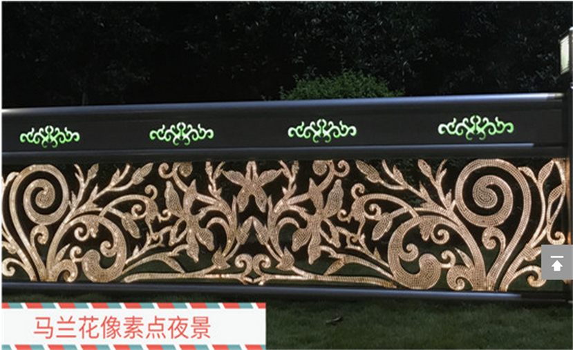 護欄體用不銹鋼材料雕刻、點焊成型。造型是鄂爾多斯市花馬蘭花。作品前后兩面激光切割三千個以上的小孔,作為出光像素點,內(nèi)貼高目數(shù)不銹鋼防蟲網(wǎng),腔體內(nèi)根據(jù)造型曲線內(nèi)埋LED軟燈帶,并用專業(yè)卡扣固定。護欄上部橫向鏤空四朵馬蘭花紋飾,并用帶色透明樹脂填充。