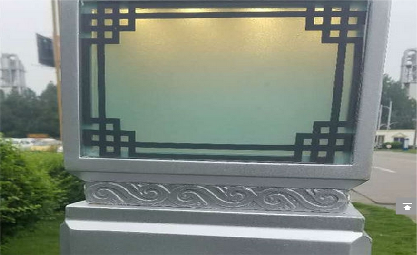 柱體前后兩面、柱頭四面用厚度足夠的磨砂玻璃實現(xiàn)內(nèi)透,玻璃外以陽雕形式粘貼金屬雕刻件,腔內(nèi)隱藏光源實現(xiàn)內(nèi)透。