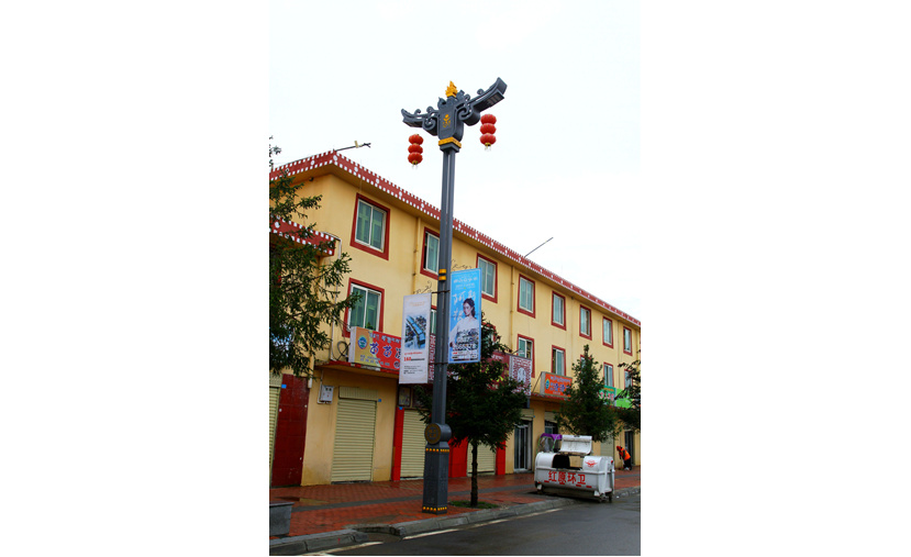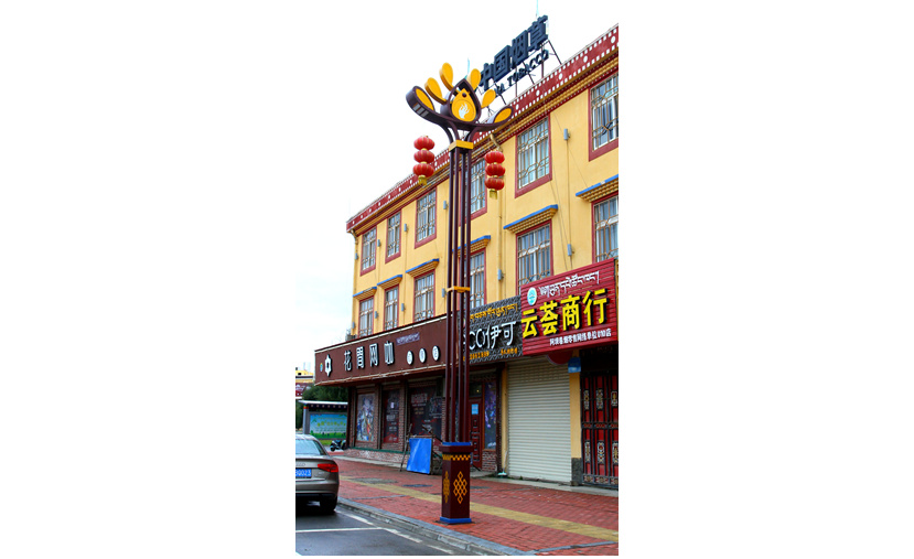 安裝在S209線的“犇?!睙粢愿呱礁吆貐^(qū)特有的珍稀牦牛為設計元素,牦牛被藏族人民稱為“高原之舟”。設計者通過燈型主體將牛頭牛角外部輪廓展現出來,塑造了一個栩栩如生、富有力量感和氣勢磅礴的犇牛形象。燈桿中部燈箱絲印臧八寶圖案,內置LED光源,愿當地民眾吉祥常在,眷屬和睦,所求如愿。