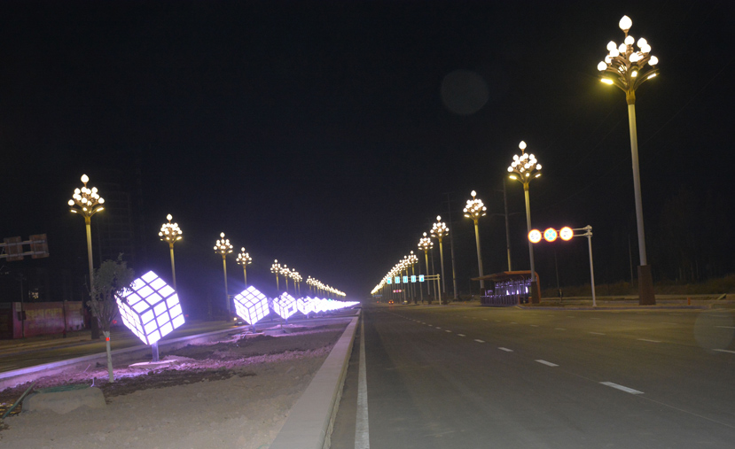 2015年6月,華體照明承接了新疆哈密市區(qū)主要道路路燈改造工程,該工程歷時4個月時間,于2015年10月結(jié)束。荔枝中華燈,即“花燈”,指的是多頭,植物造型的燈桿。該款燈在傳統(tǒng)中華燈的基礎(chǔ)上進(jìn)行了改良,保留其神韻,加入荔枝的元素,巧妙地將荔枝的形態(tài)與花燈完美結(jié)合。為表現(xiàn)哈密為“哈密瓜”之鄉(xiāng)的地域文化,此次燈型設(shè)計為四層荔枝的裝飾光源,從遠(yuǎn)處看其外形輪廓酷似哈密瓜,特別是夜間亮燈后,更是形態(tài)逼真,不僅為夜間市民的出行提供便利,更加提升哈密的城市形象。